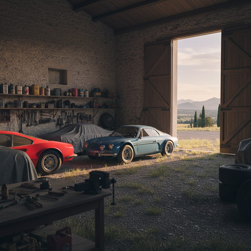 Alignement de voitures de collection françaises dans un atelier de restauration près de Lyon